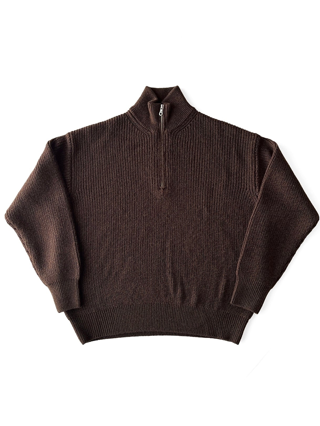 ウールアクリル素材でミドルゲージのハーフジップニット。 衿は折り返しての着用も可能。 カジュアルになり過ぎないスマートなシルエット。 ミックスのブラウンカラー。 XLサイズ 着丈68 身幅66 肩幅58 袖丈58 WOOL 50% ACRYLIC 50%