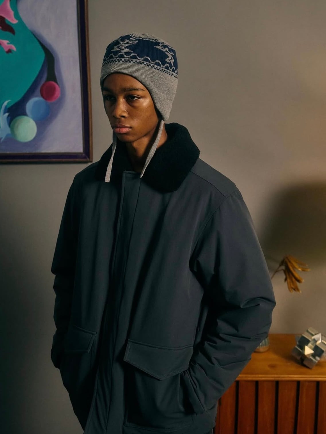 衿には密度の高いボアを配置しフライトジャケットライクな雰囲気を演出。