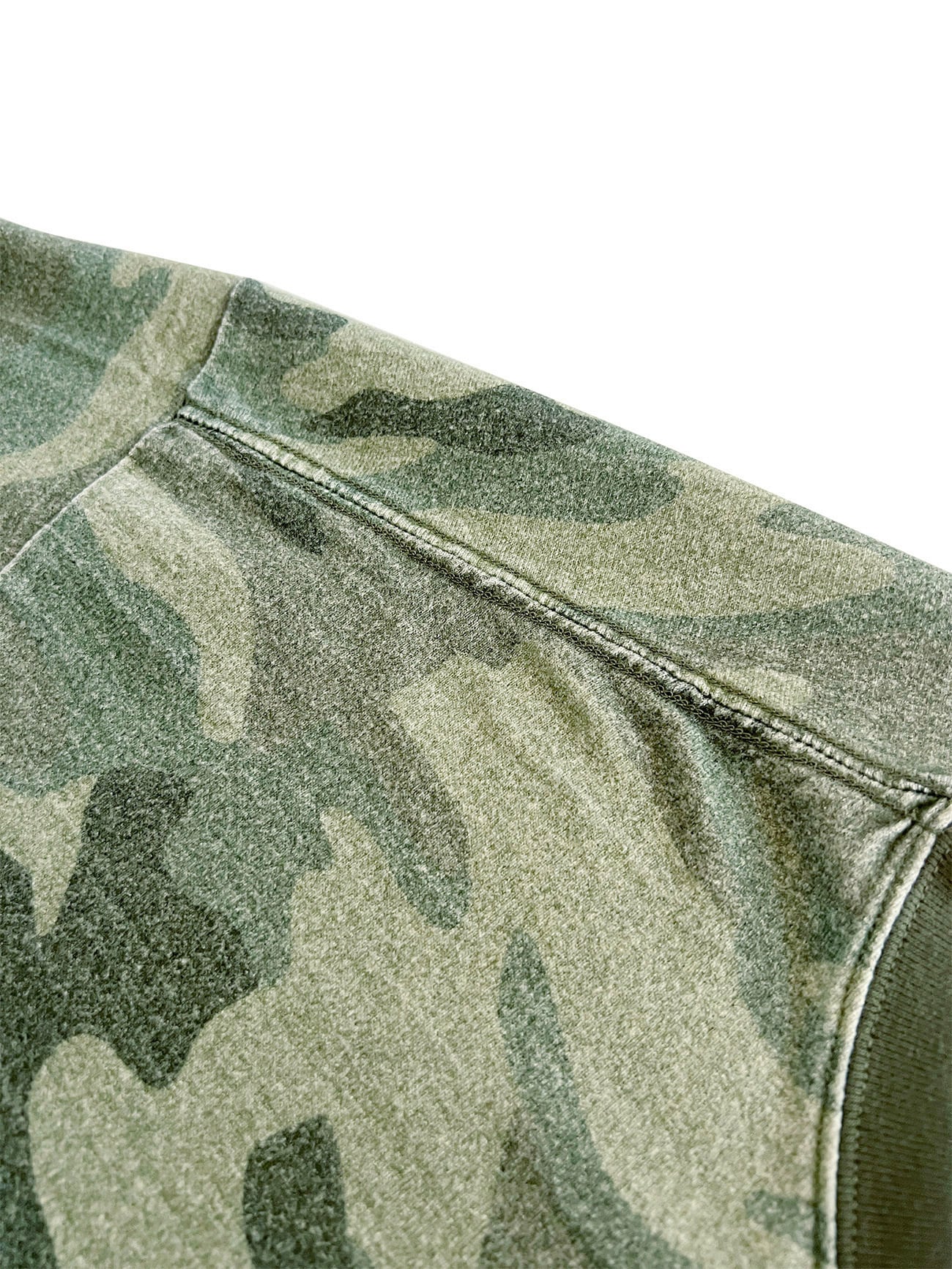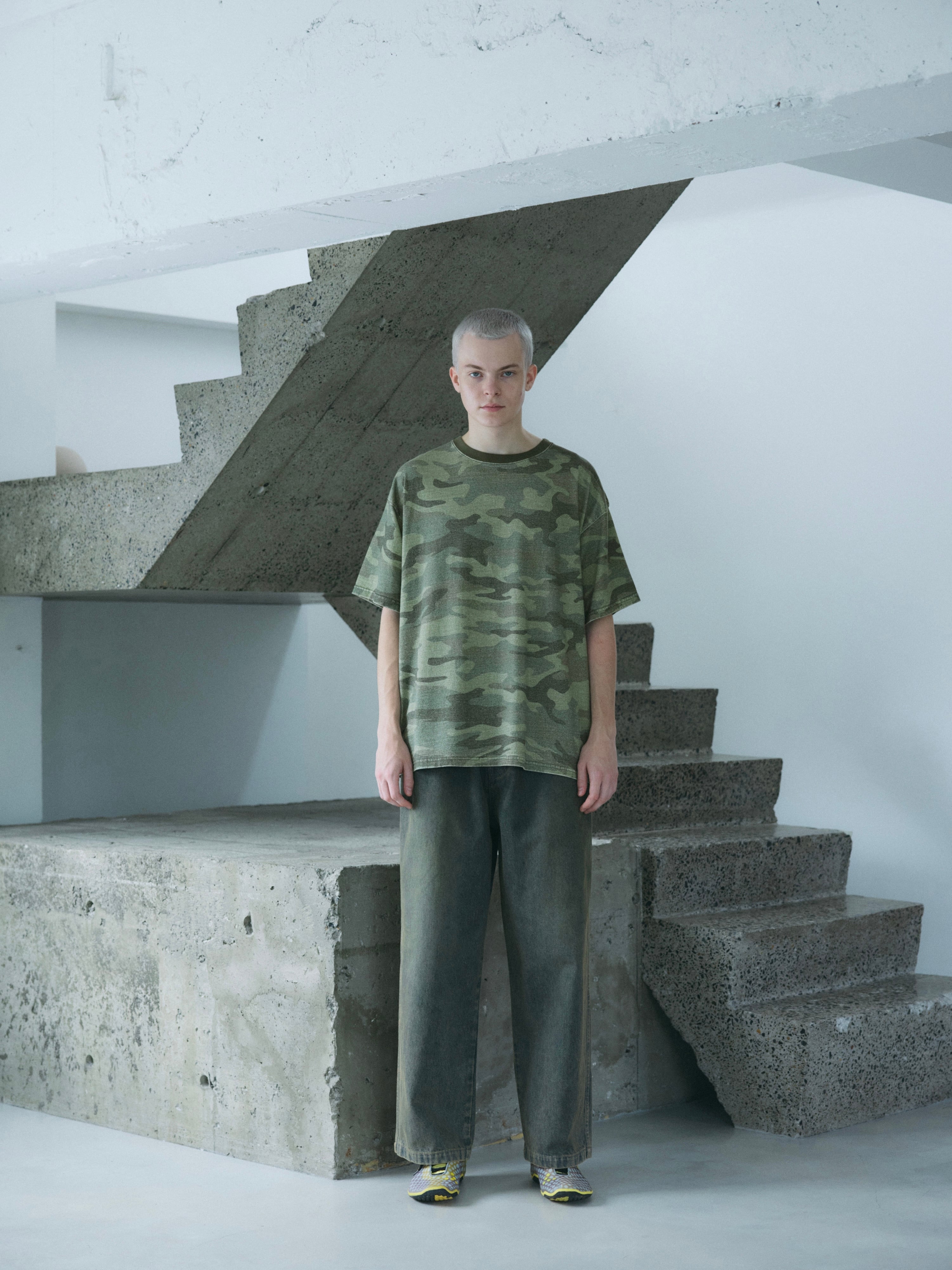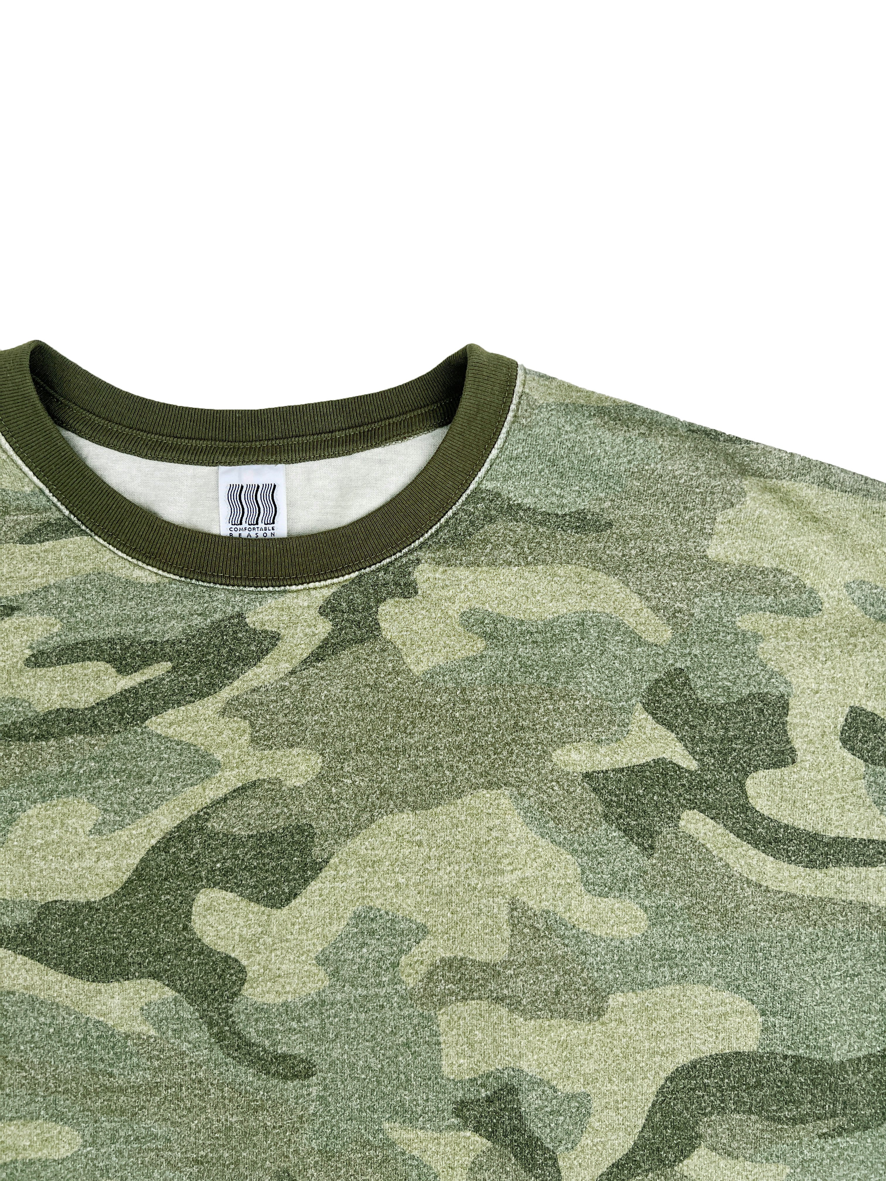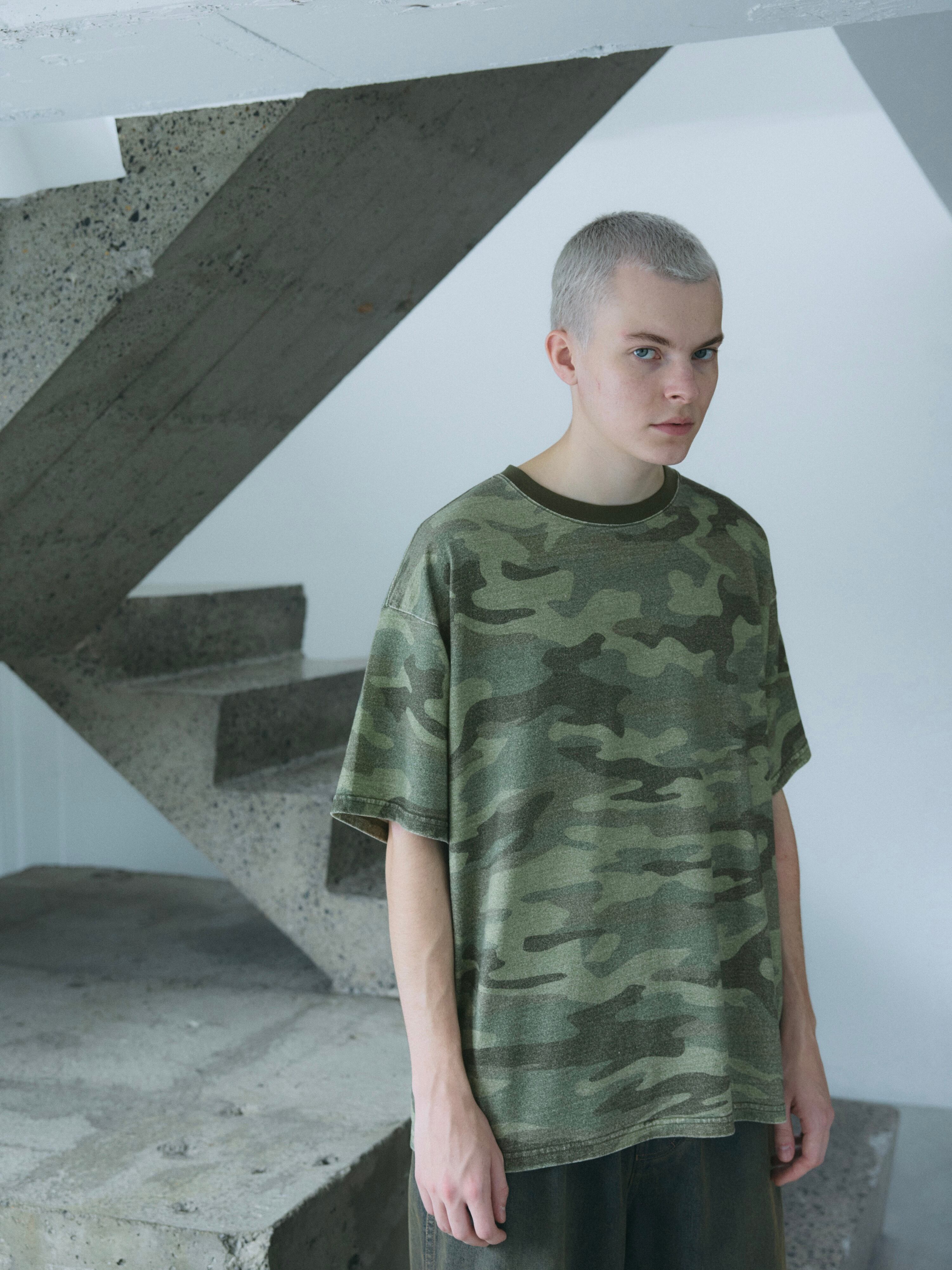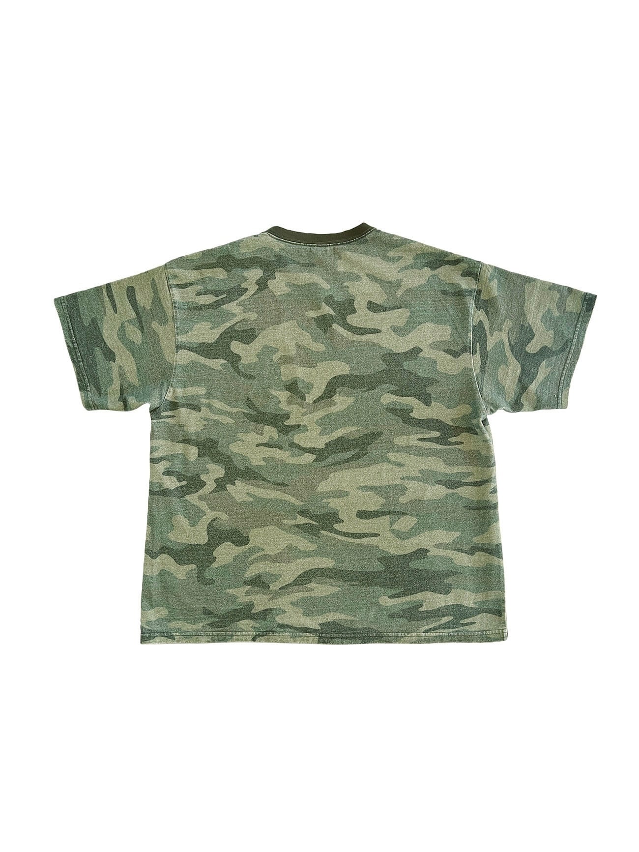 歪みのかかったオリジナルカモパターンのS/STシャツ。 杢調の素材に顔料プリントを施しエイジング加工をした独特の風合いと褪色感が特徴。 グリーン系のみで構成したオリジナルカモフラージュ。 XLサイズ 着丈73 身幅62 肩幅57 袖丈21.5 COTTON 100%