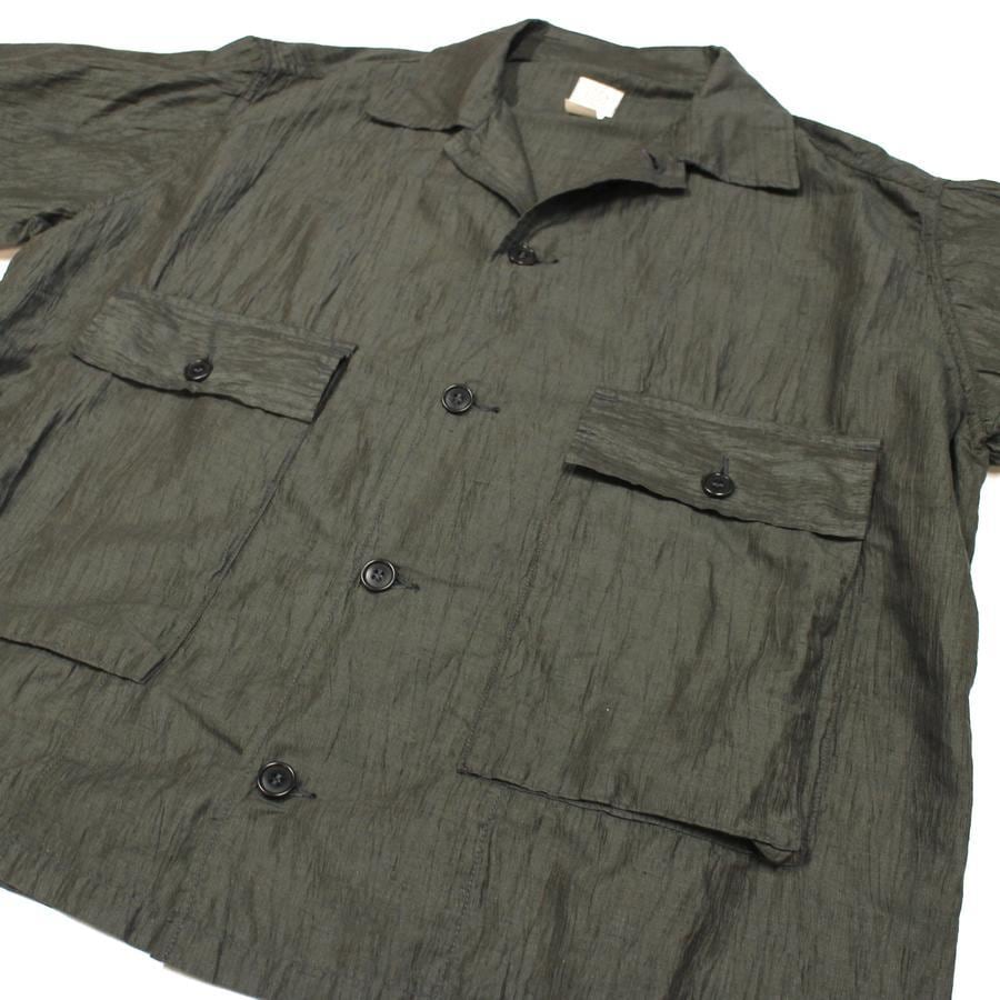 この一枚はシワ加工されたリネン/コットン地を使用しており、暑い日にも身体に接する生地の面積がコントロールされた、非常に涼しいものとなっています。