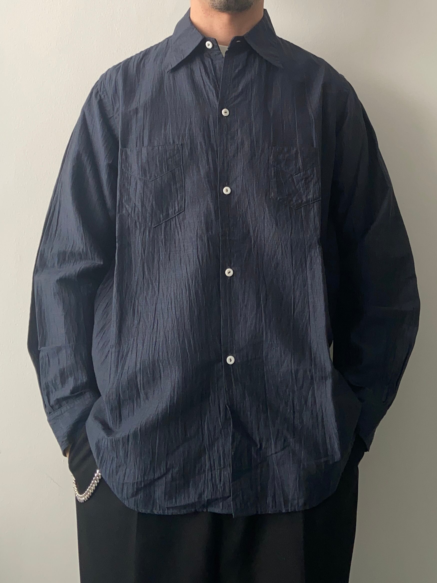 この一枚はシワ加工されたリネン/コットン地を使用しており、暑い日にも身体に接する生地の面積がコントロールされた、非常に涼しいものとなっています。
