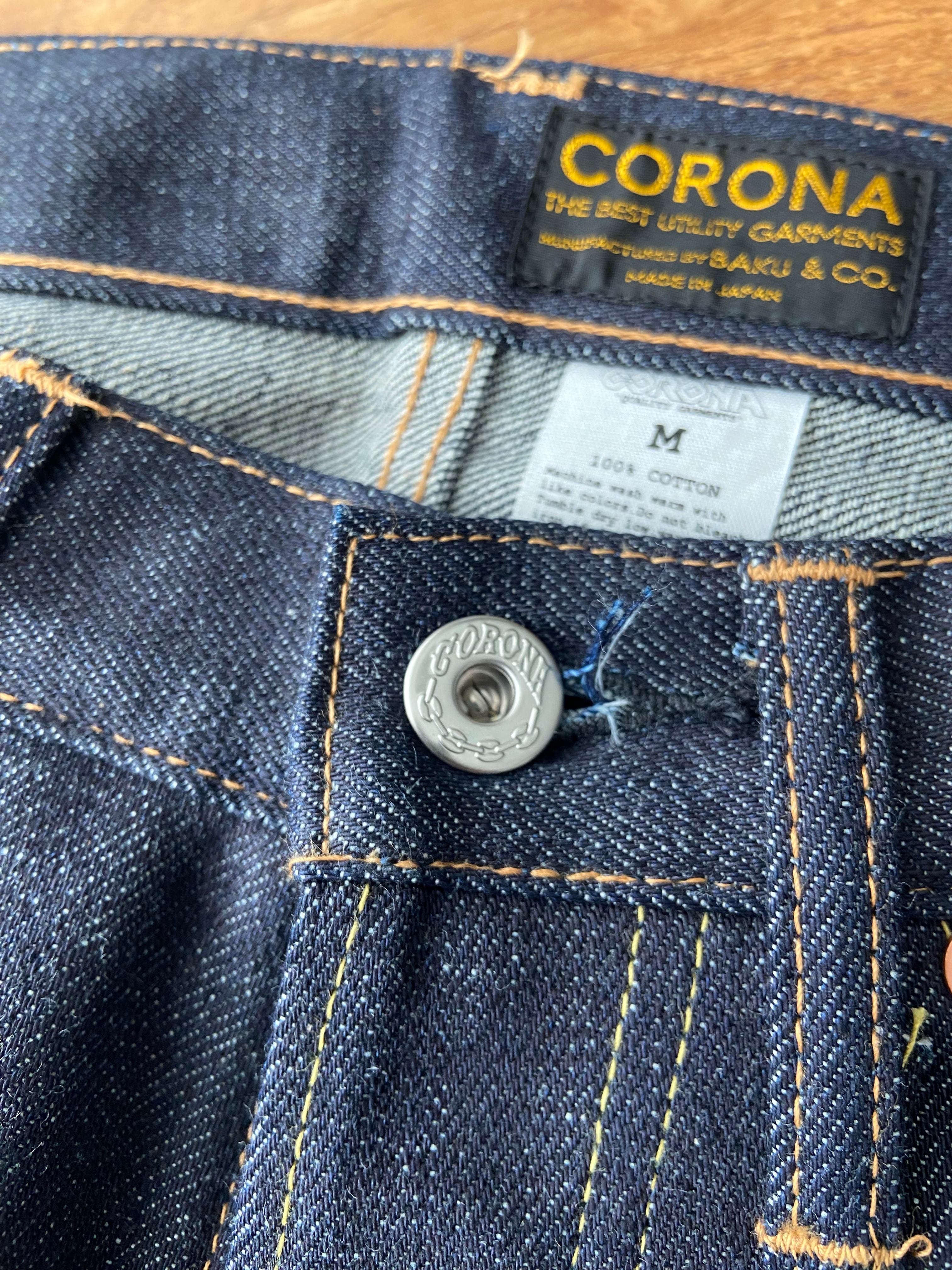 CORONAオリジナルのドーナツ釦をフロントトップに使い、リベットでポケット口を補強するオーセンティックなデザインです。