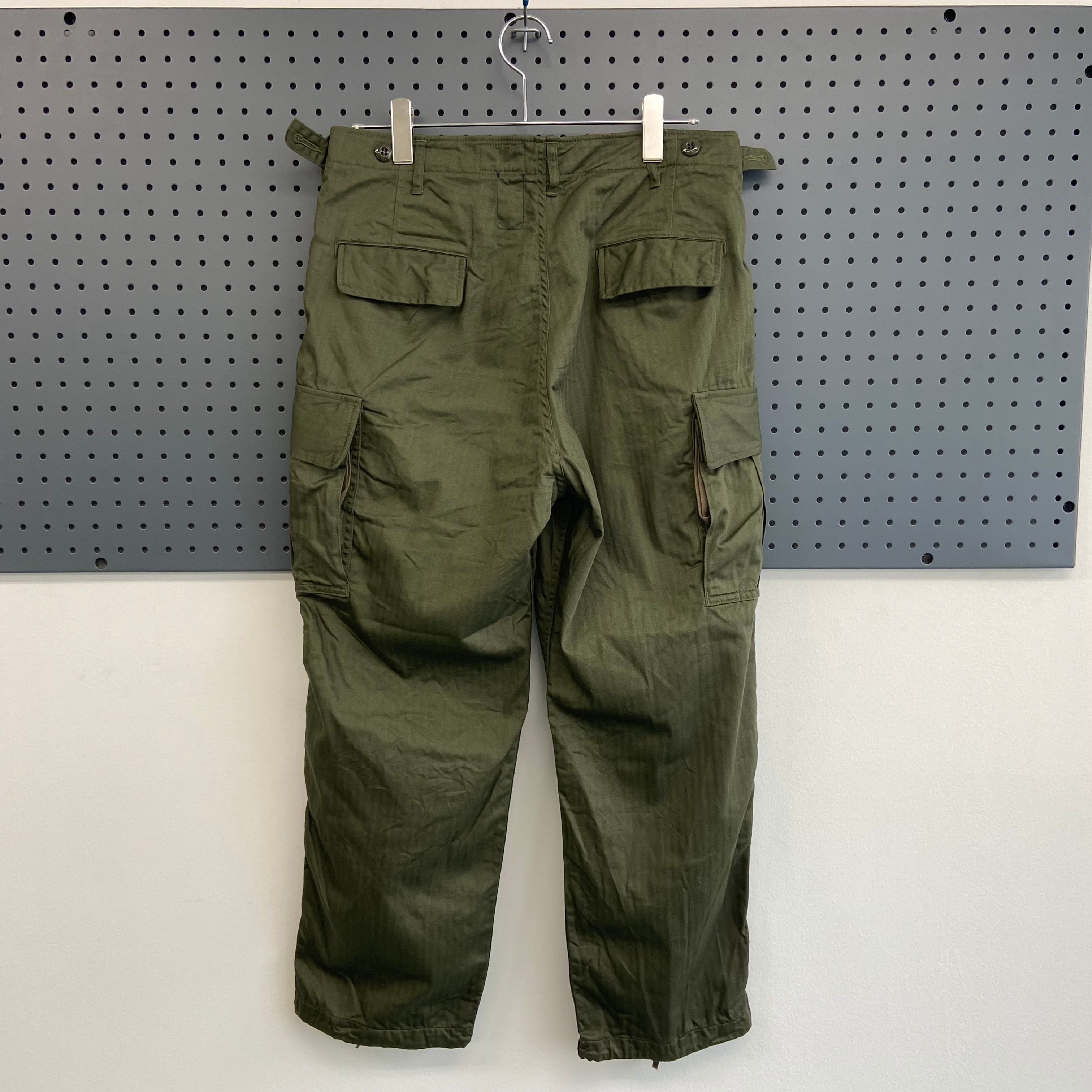 ヘリンボーンツイルのジャングルファティーグパンツという、今までにありそうでなかったミリタリーパンツです。