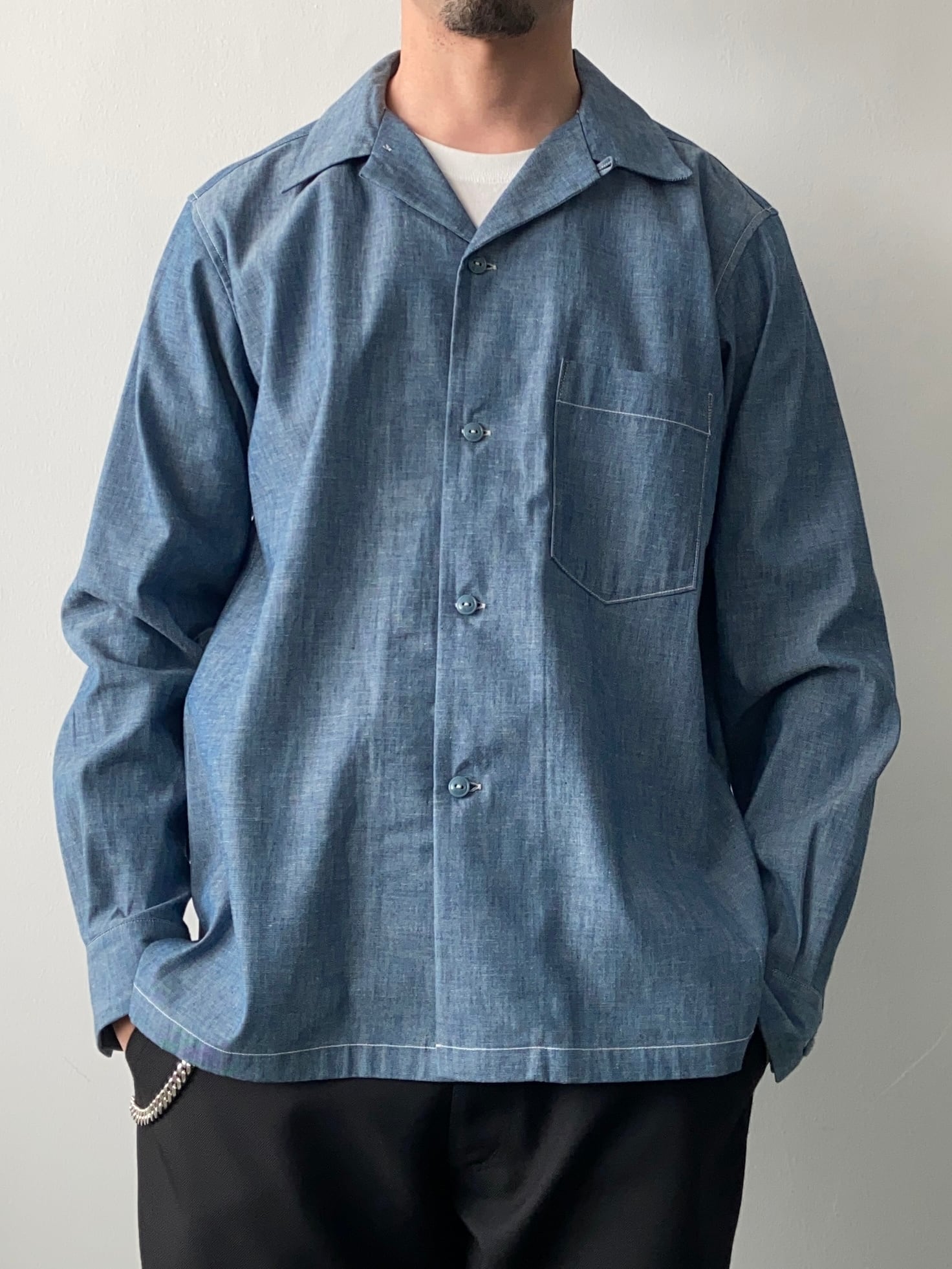 左胸1ポケットのオープンカラーシャツ。