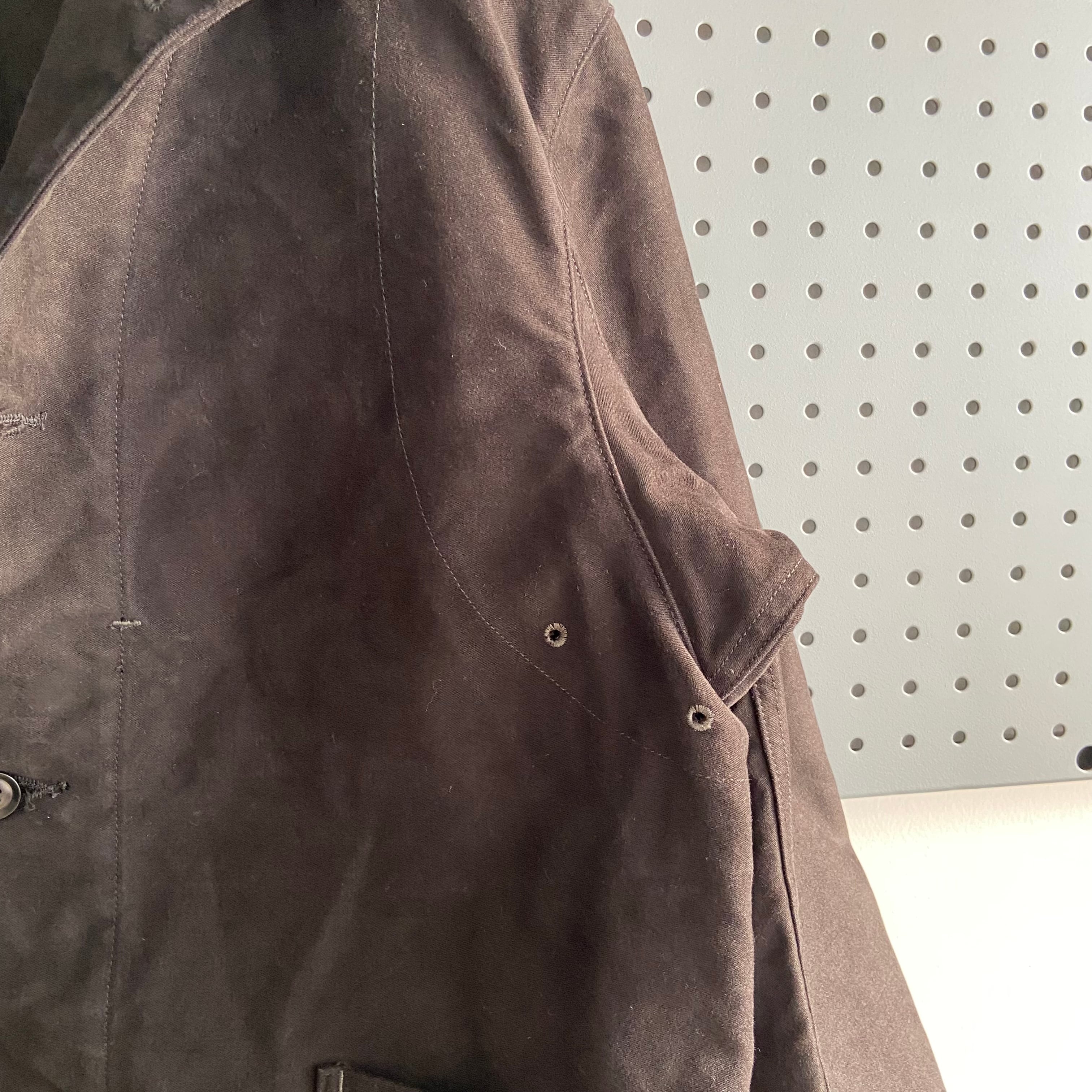 また、前身頃内側全体がハンティングジャケットのゲームバッグ(獲物入れ)を利用した内ポケットとなっていて、そのポケット口を補強したカンドメが一つのアクセントにもなっています。