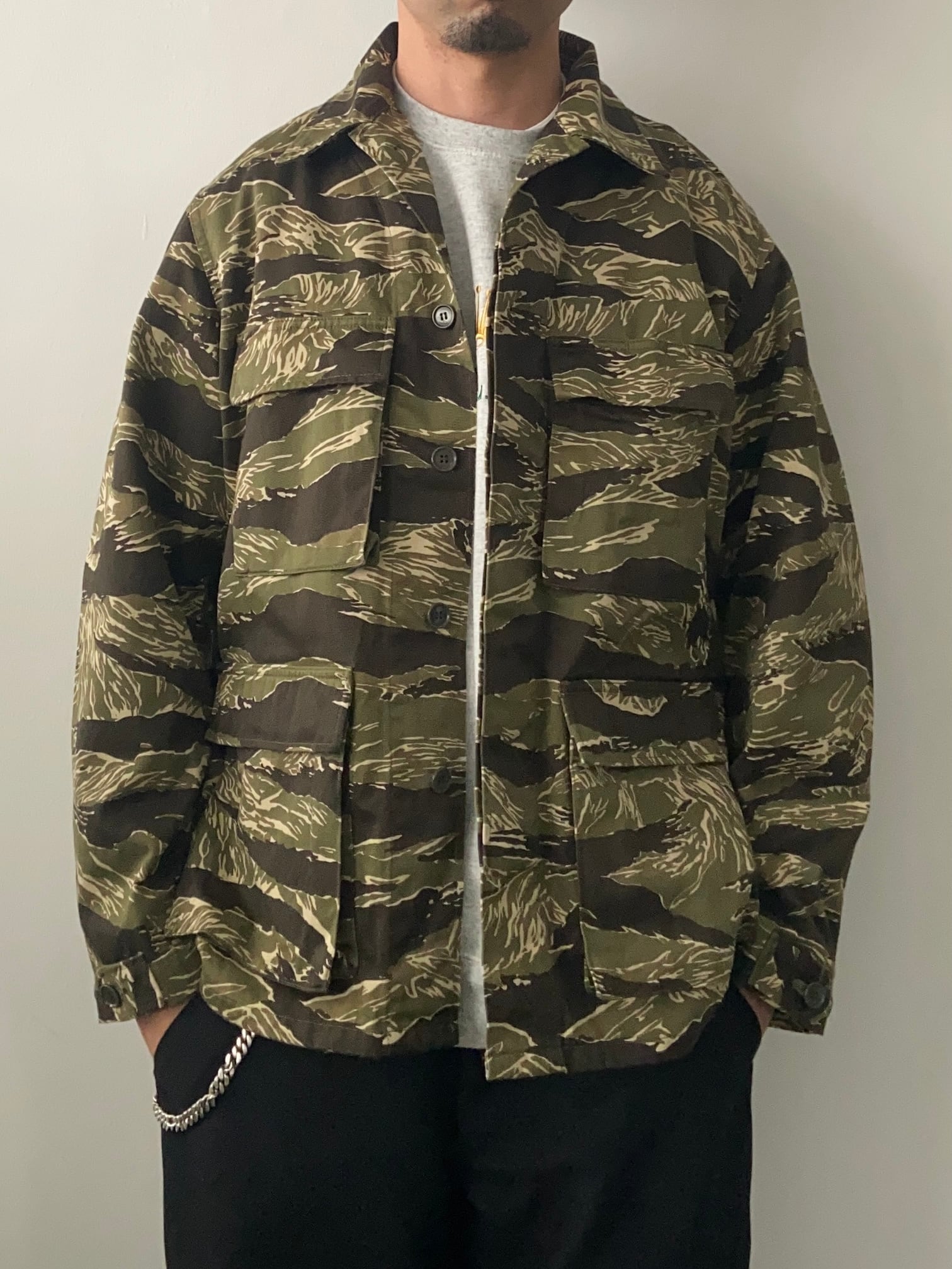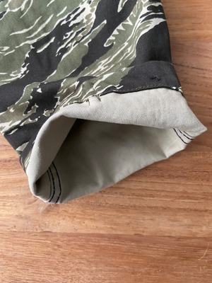 生地は60年代のタイガーストライプ迷彩 "JWD" パターンを自社でレプリカしたものを使用。