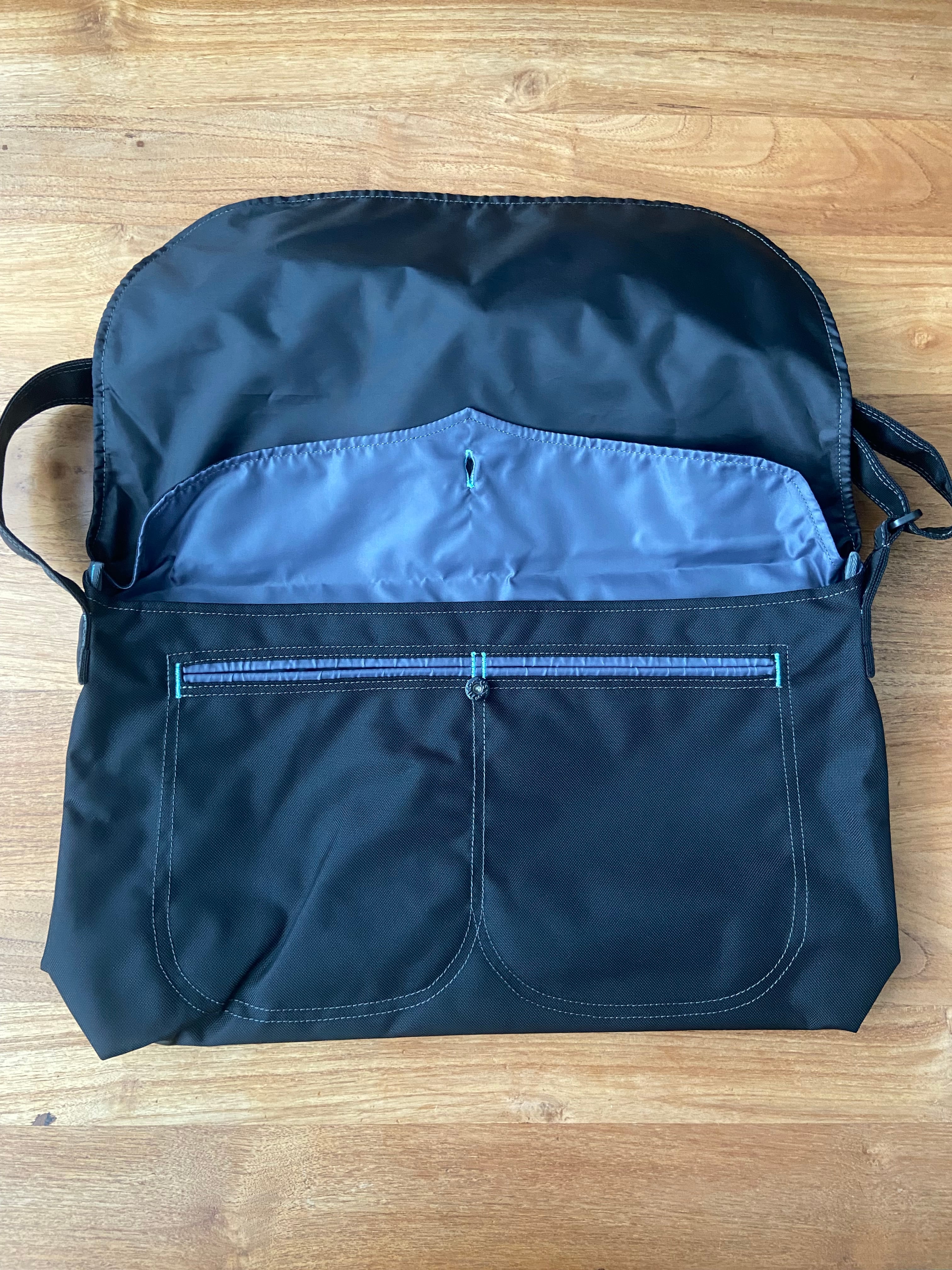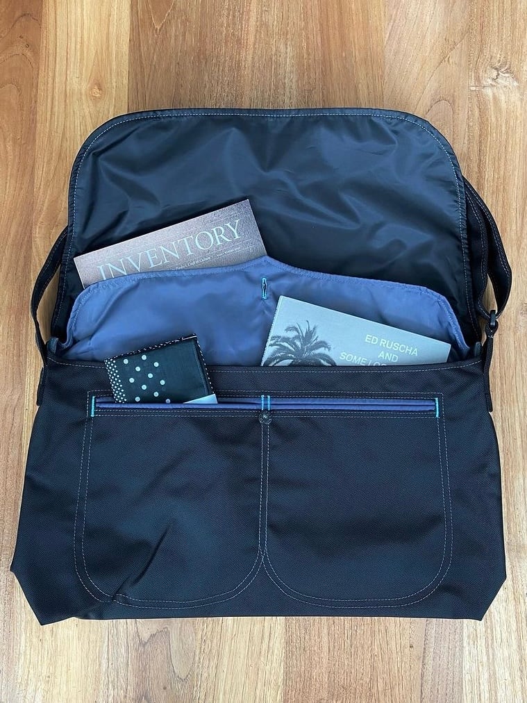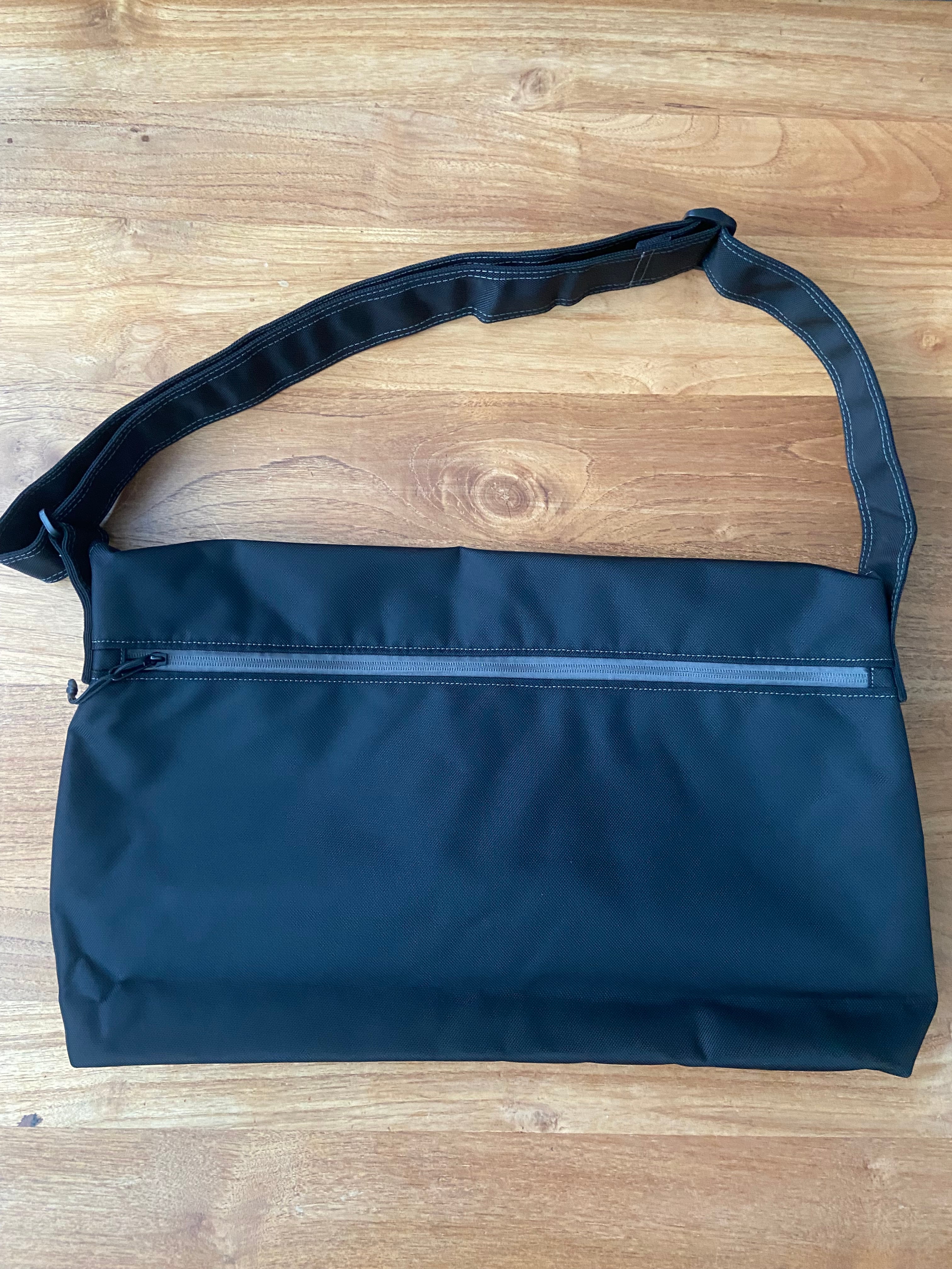 2000年頃のアーカイブより。 ナイロン・オックスフォード素材。 POST O'ALLSのドーナツボタンを付けたロイヤルトラベラーを彷彿させる2連ポケット。 随所にPOST O'ALLSらしいターコイズステッチが映えるショルダーバッグです。 高さ33 幅49