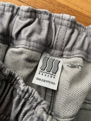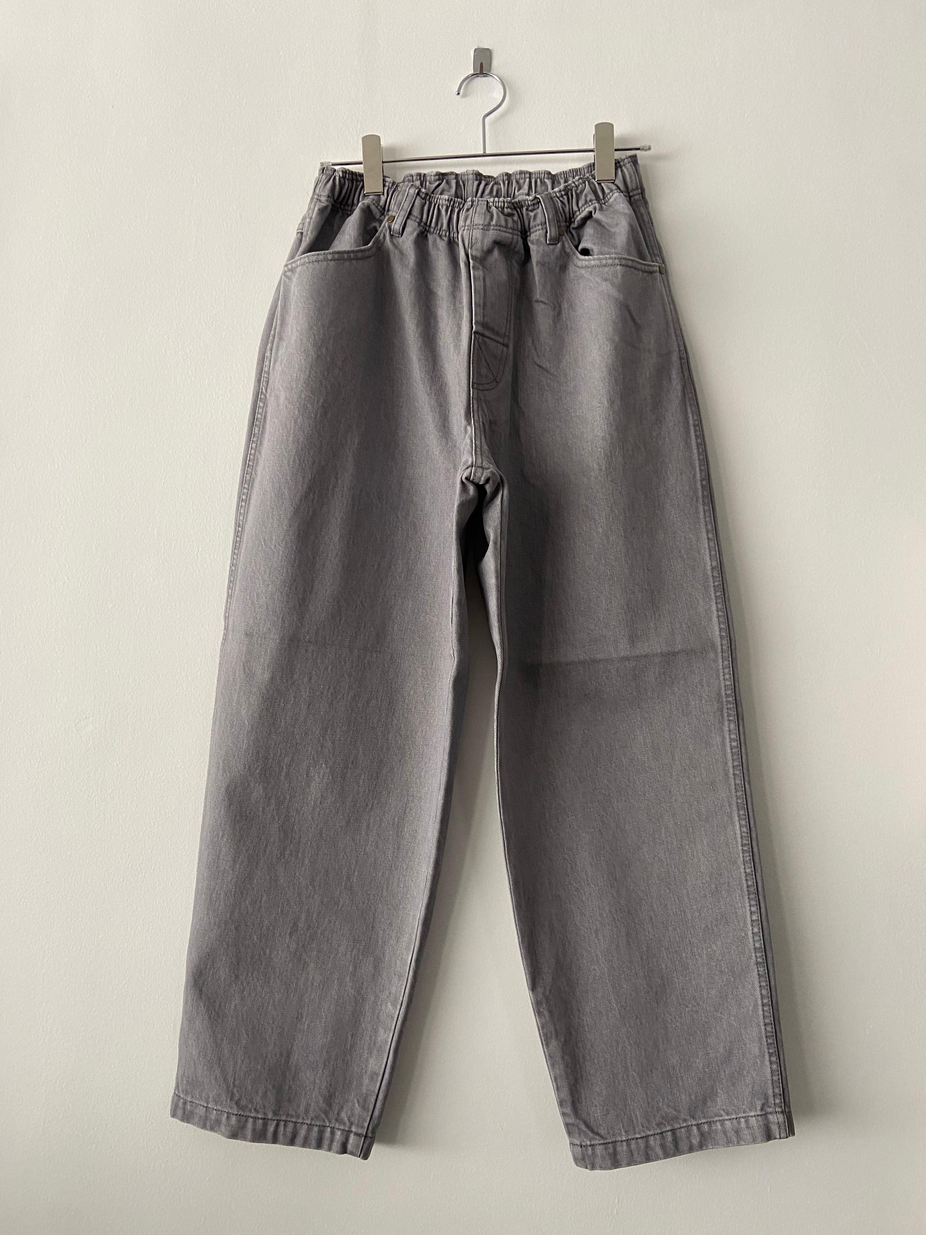 定番のRODEO SLACKS 13.5ozのムラ糸デニム。 グレーのバイオウォッシュ加工。 ポケットのリベットとネームがアクセント。 ウエストはゴム仕様ながらベルトループ付き。 ボタンもジップも付かない比翼の前開き仕様。 ONE SIZE FIT'S ALL ウエスト 68 - 90 股上 32 股下 70 ワタリ幅 37.4 裾幅 22 COTTON 100% MODEL 182cm70kg