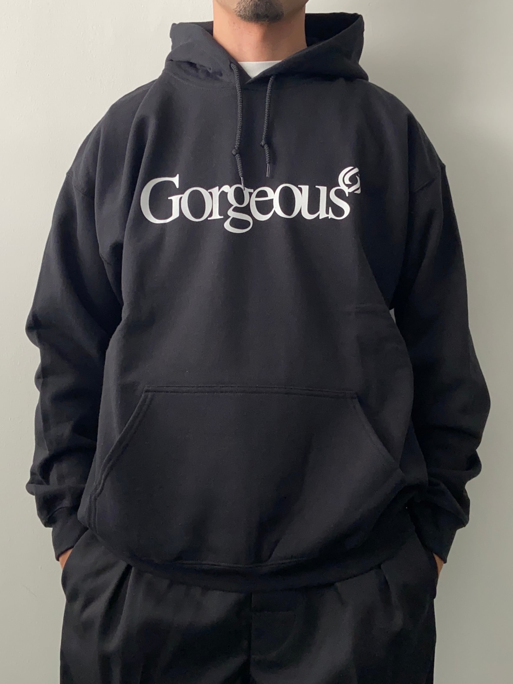 フロント、バックに"gorgeous"とプリントしたフーディー。 8oz.裏起毛 Mサイズ 着丈68 身幅55 裄丈86 Lサイズ 着丈71 身幅61 裄丈88 XLサイズ 着丈73 身幅66 裄丈91 COTTON 50% POLYESTER 50% MODEL 182cm70kg / XLサイズ