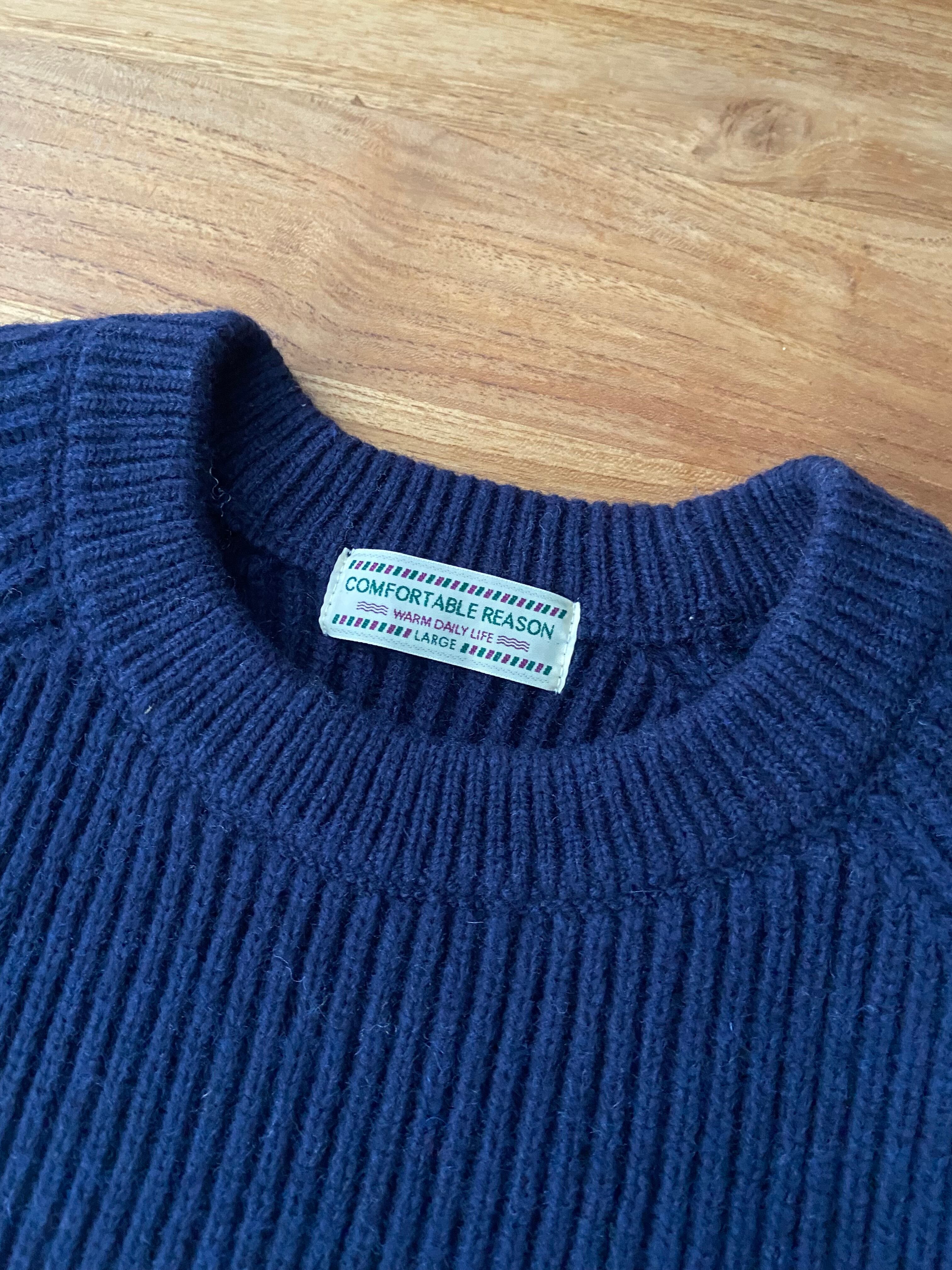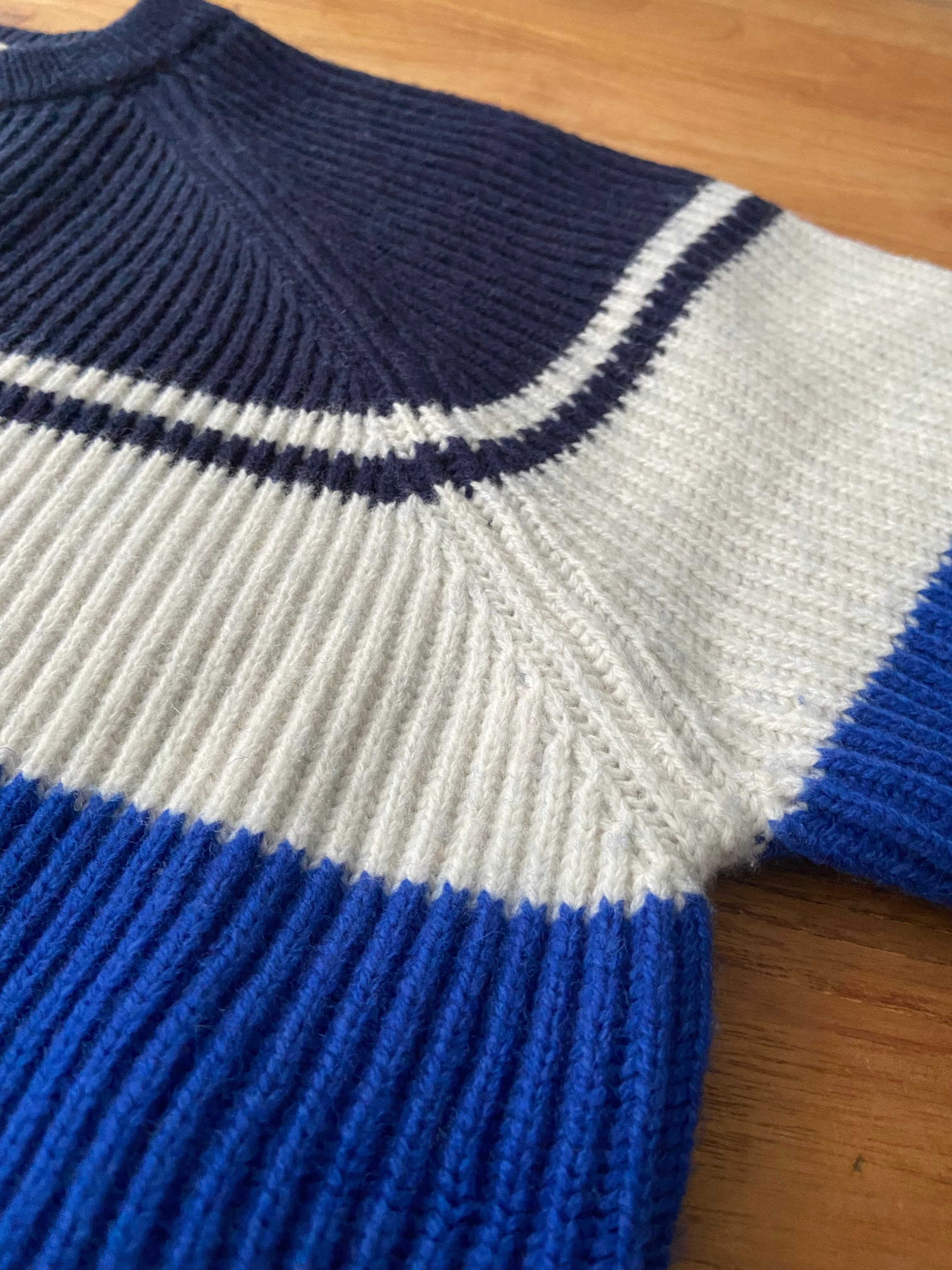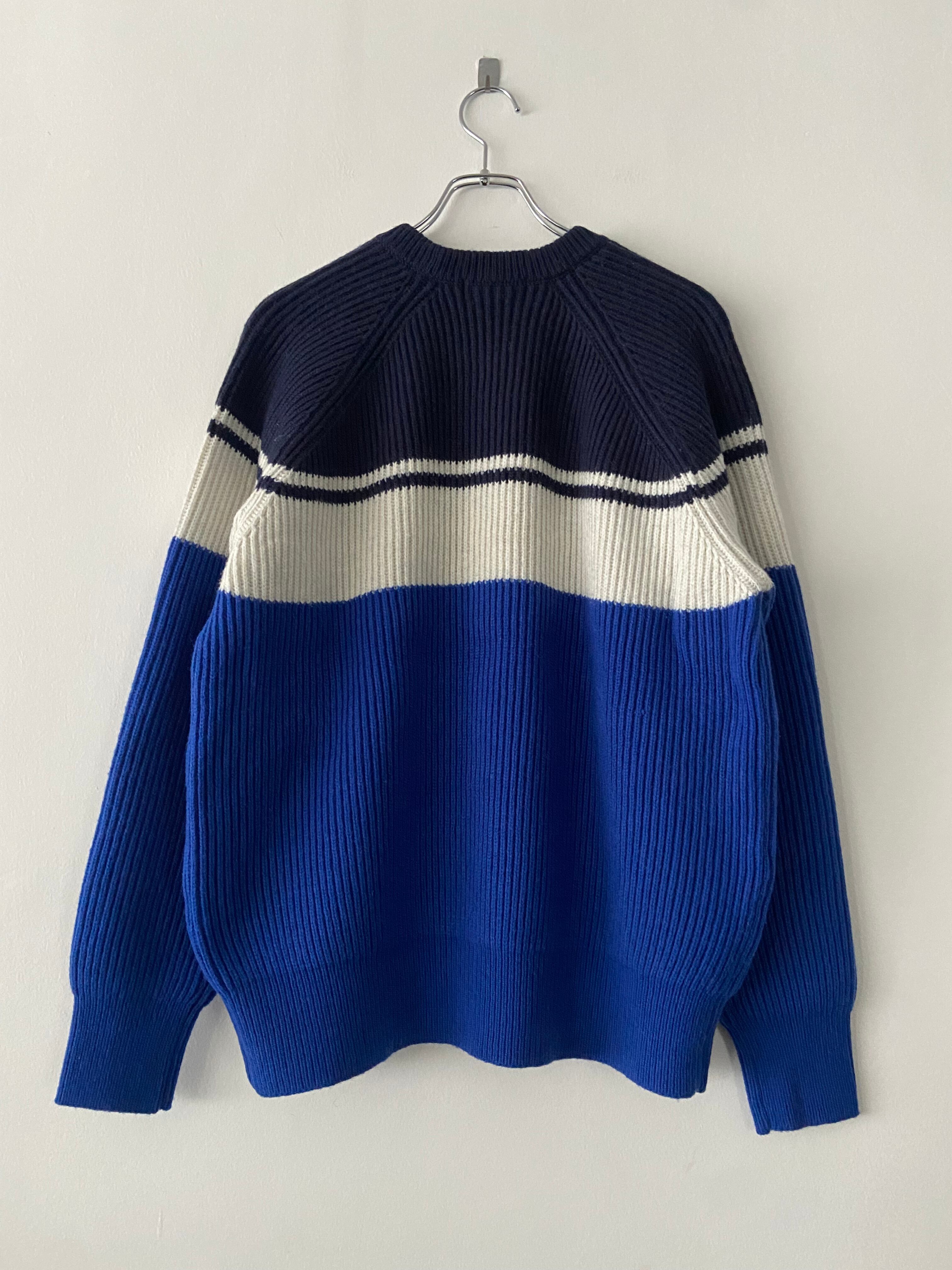 80sフットボールカルチャーのトラックトップからインスパイアされたパネル配色のニット。 ウールナイロンの混紡糸を使用し畦編みにする事で保温性とボリューム感あるシルエットを演出。 パネル配色の繋がりを意識したラグランスリーブ。 Lサイズ 着丈68 身幅61 裄丈85 ウール50% ナイロン50% MODEL 182cm70kg / Lサイズ