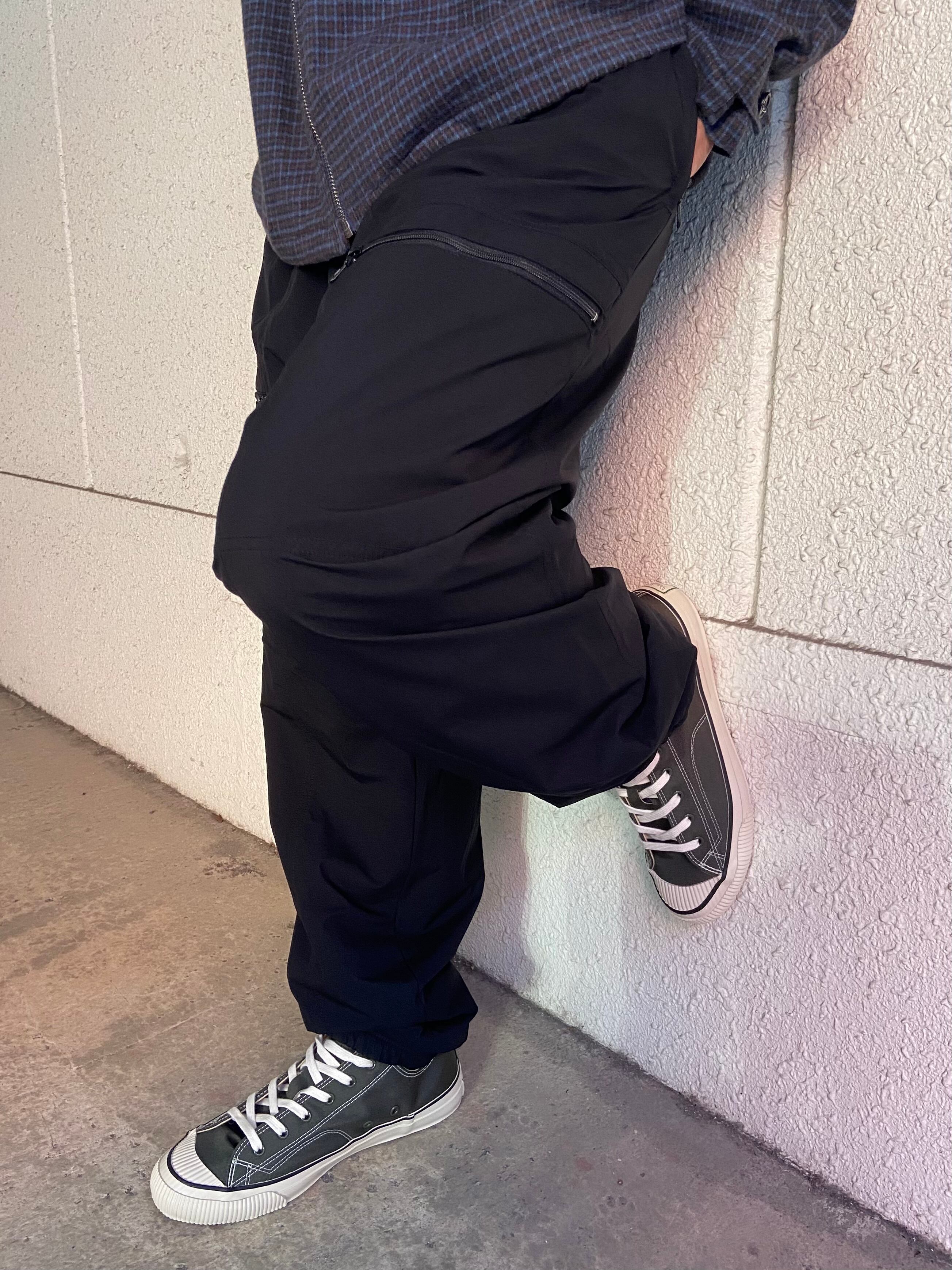 防・撥水性、透温性を兼ね備えた軽量感のあるストレッチ素材を使用したナイロンパンツ。