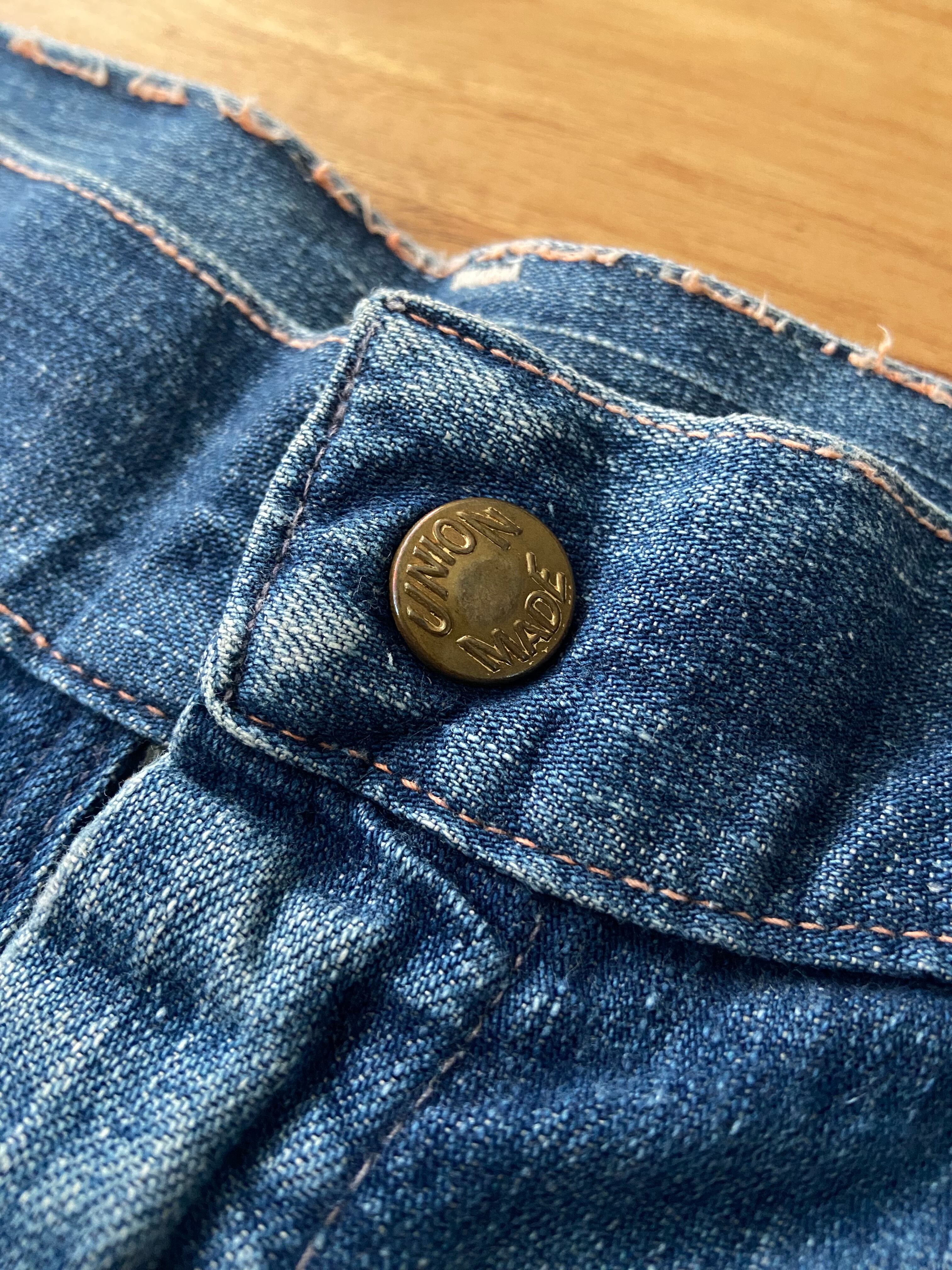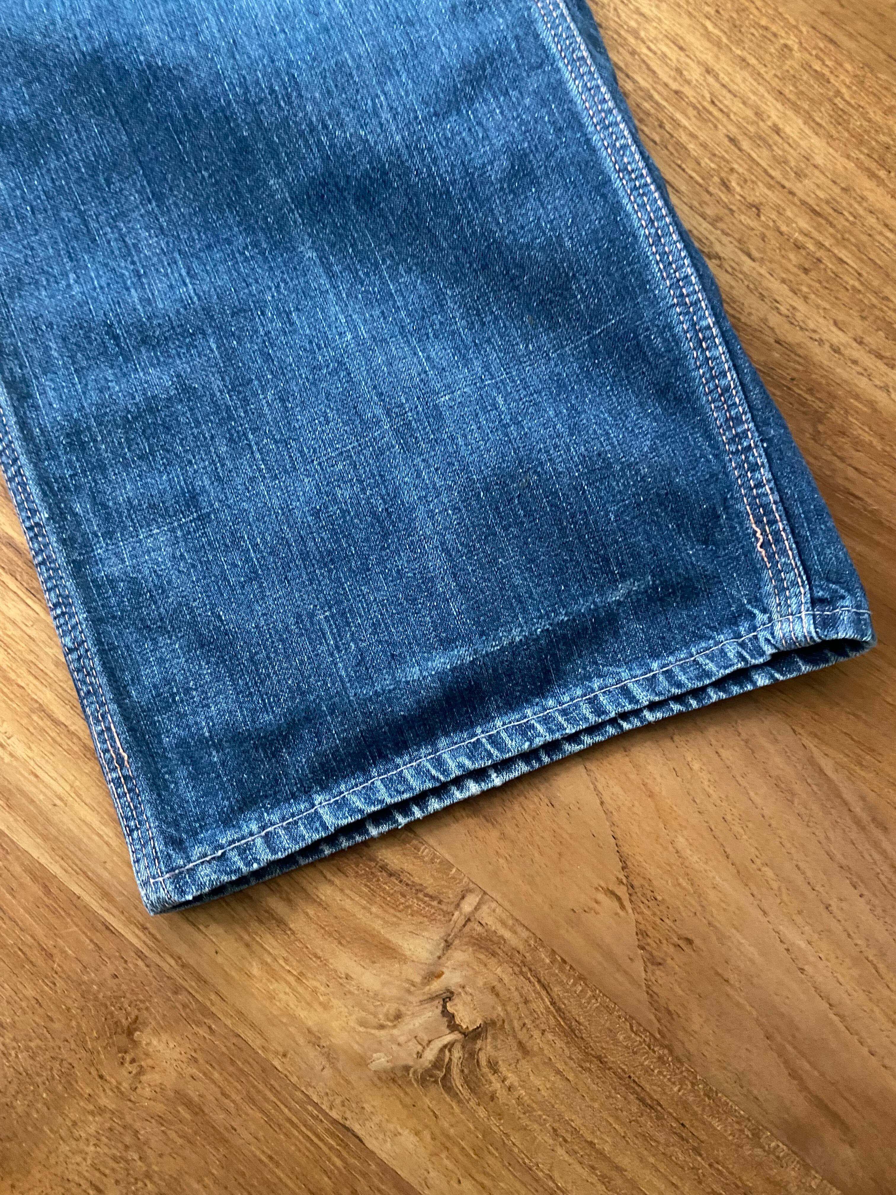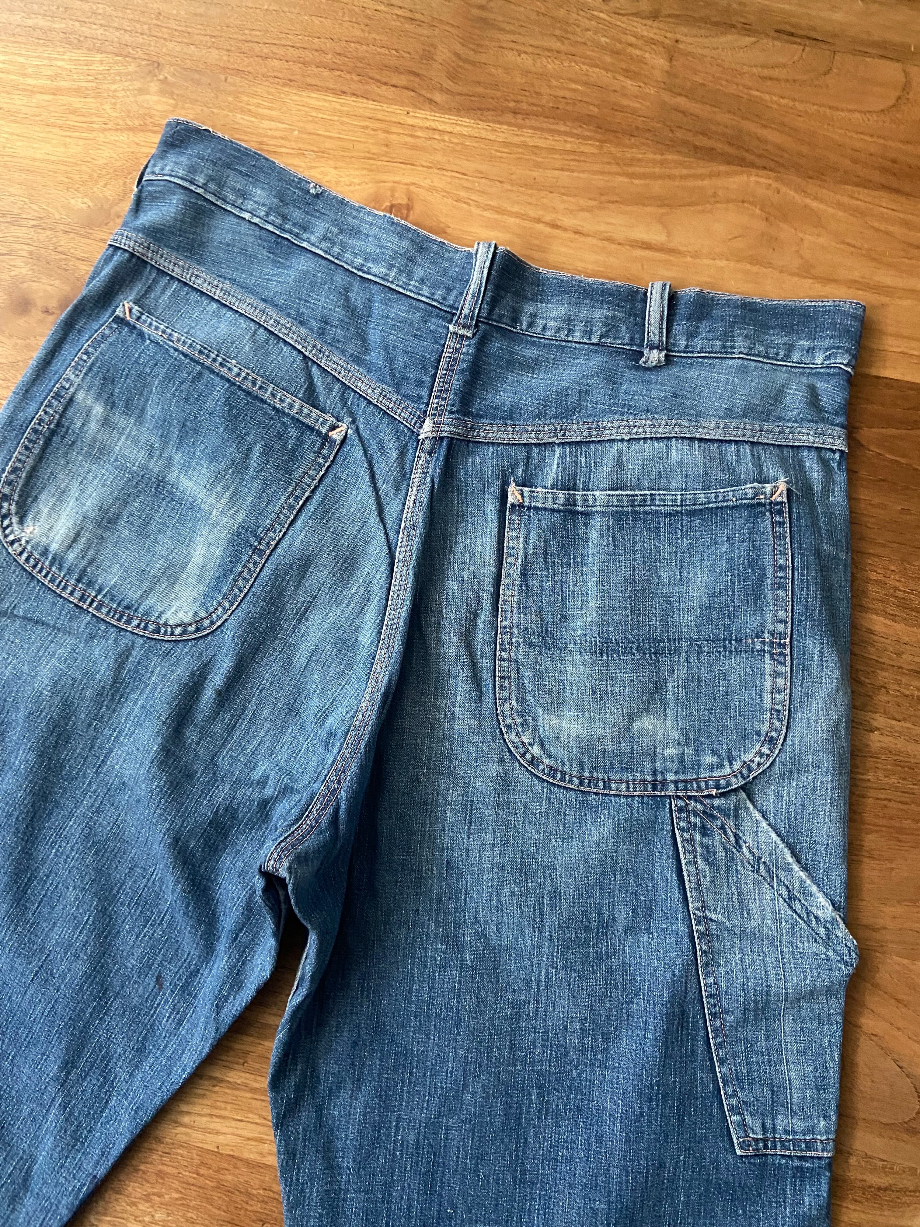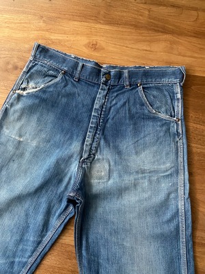 コインポケットの破れ、ベルトループの欠品、股部分のリペア等状態は悪いですがヴィンテージデニム特有の綺麗な縦落ちで雰囲気のある一本です。