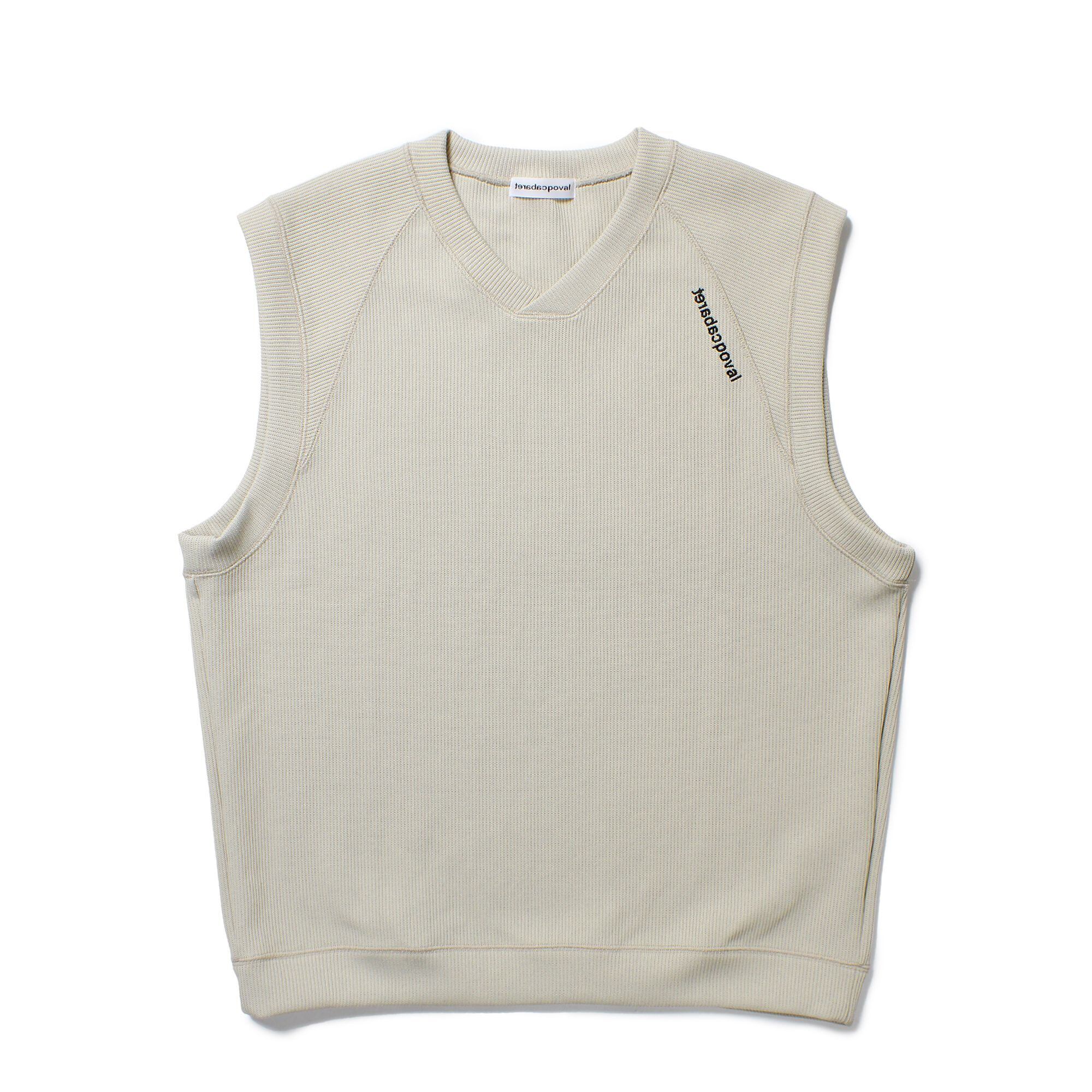 特殊なポリエステル糸を使用したニットライクなラグランベスト。 浅く緩やかなカーブのVゾーンでスポーティーにもトラッドにも振れるアイテムです。 刺繍でロゴが入ります。 Lサイズ 着丈66 身幅59 肩幅47 POLYESTER 100% MADE IN JAPAN