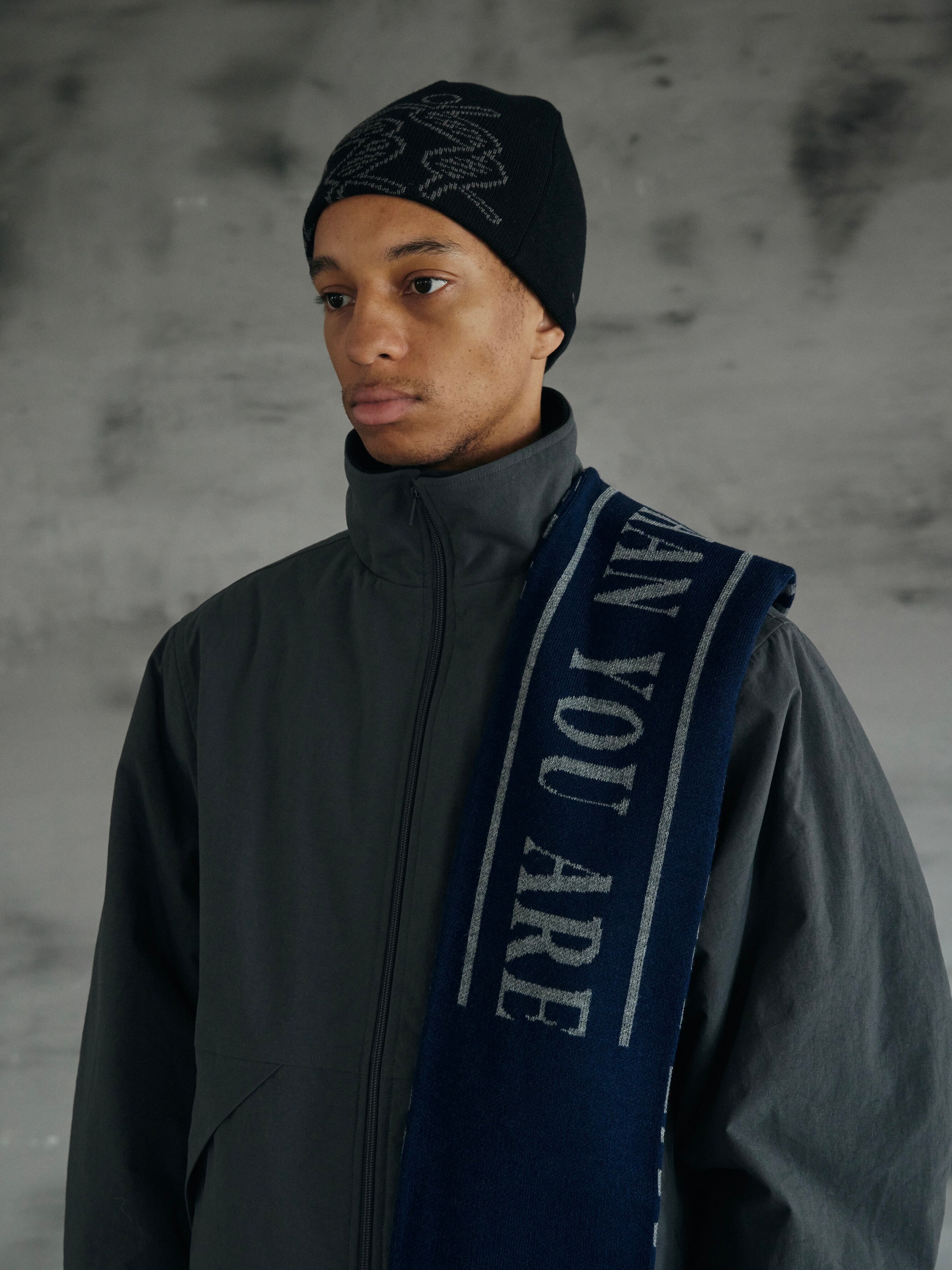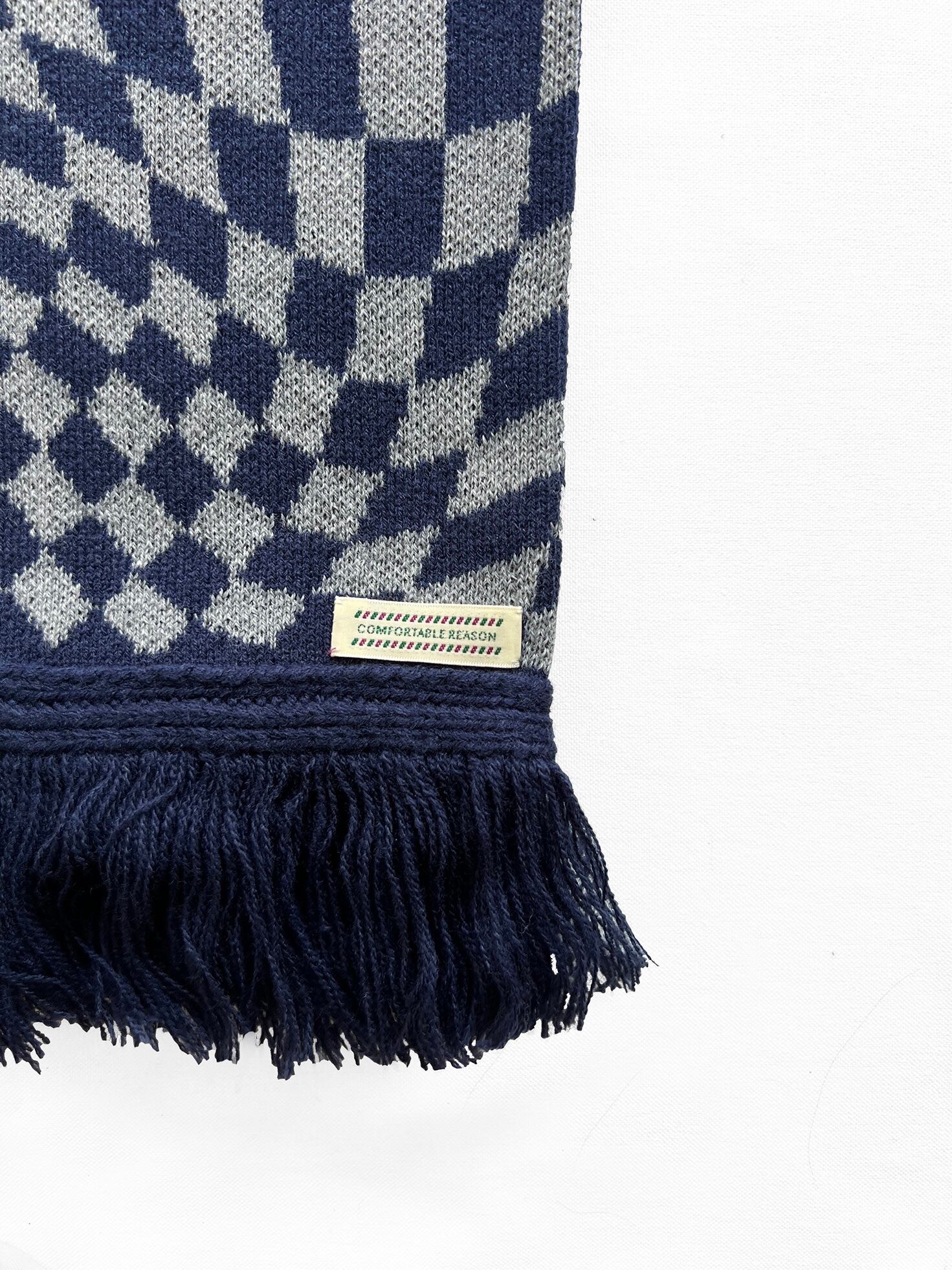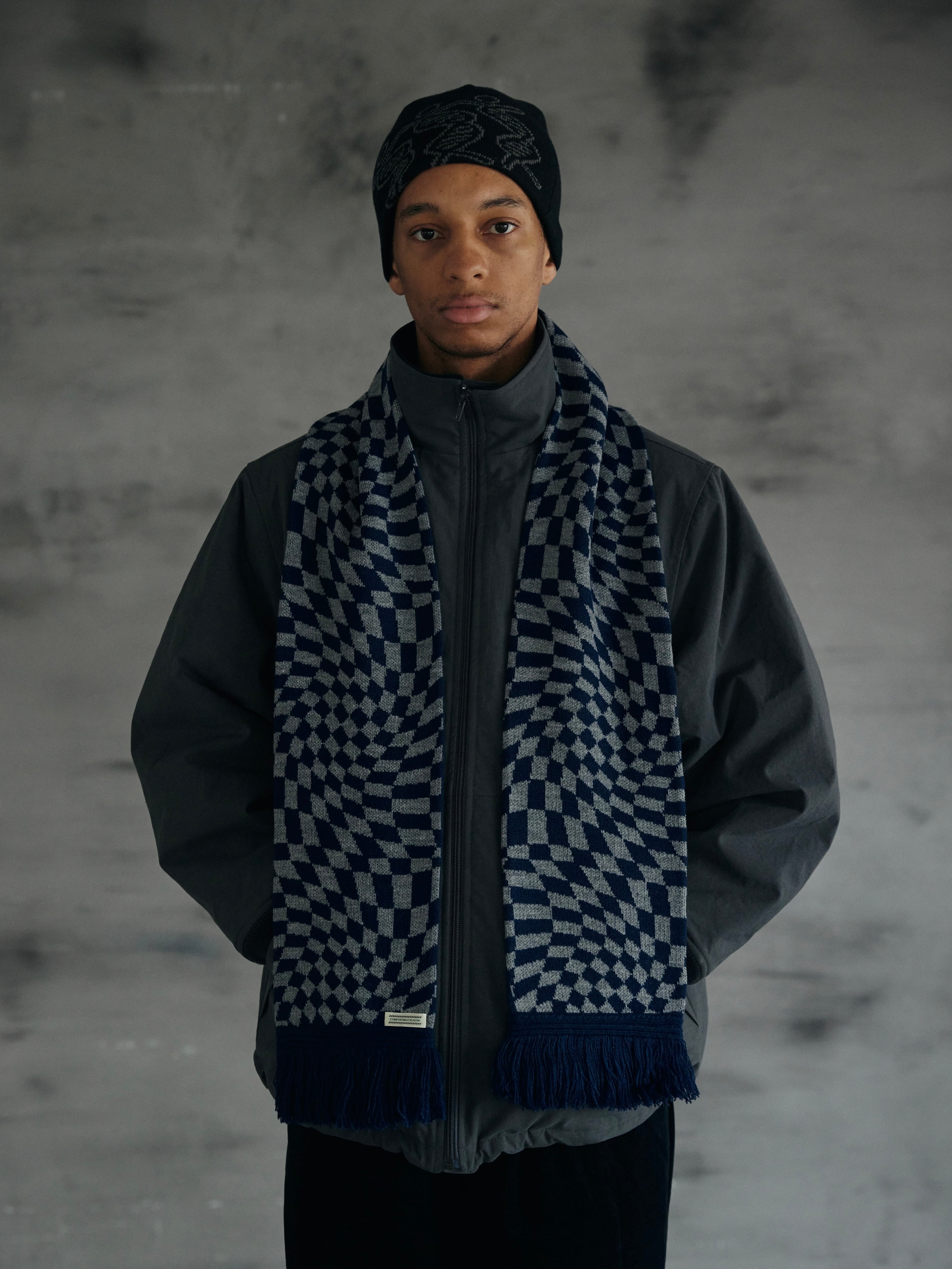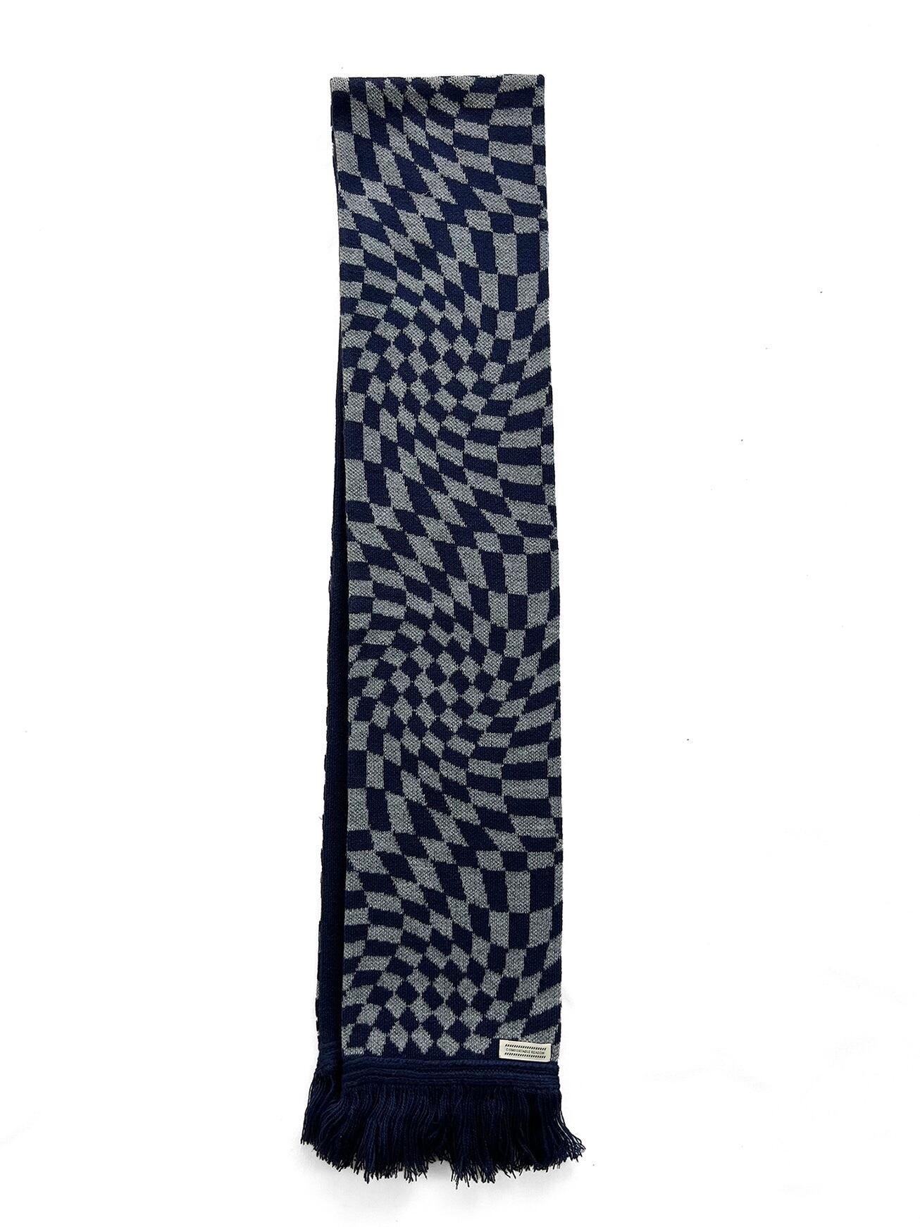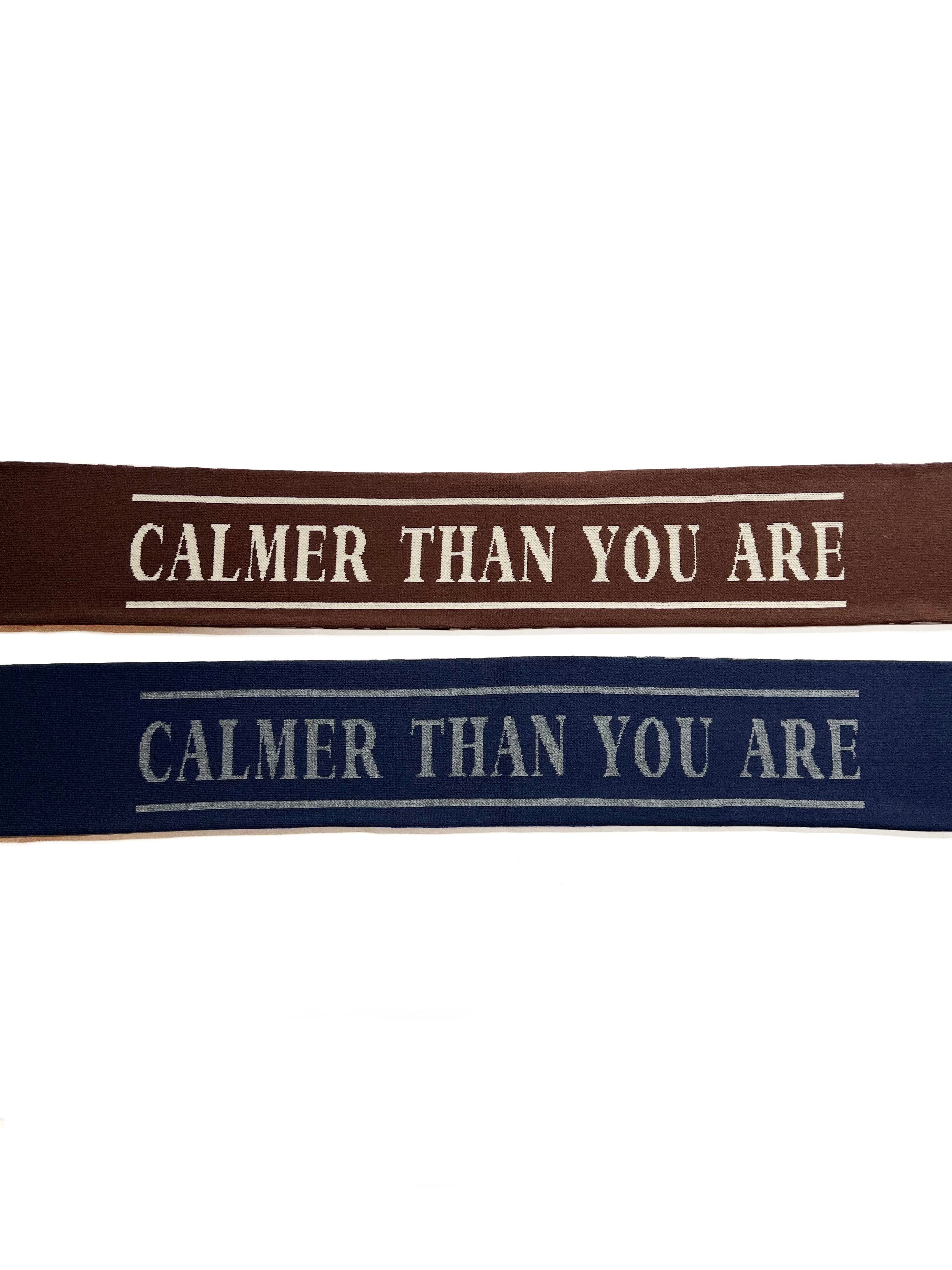 アクリル 100%で編み立てた使い勝手の良いダブルフェイスのスカーフ。 表側はサイケデリックな OP ART 調の柄をジャガードで表現。 裏側には表側に対してメッセージ性のあるCALMER THAN YOU AREのメッセージを配置。 One Size 全長:160cm 幅:17cm アクリル100%