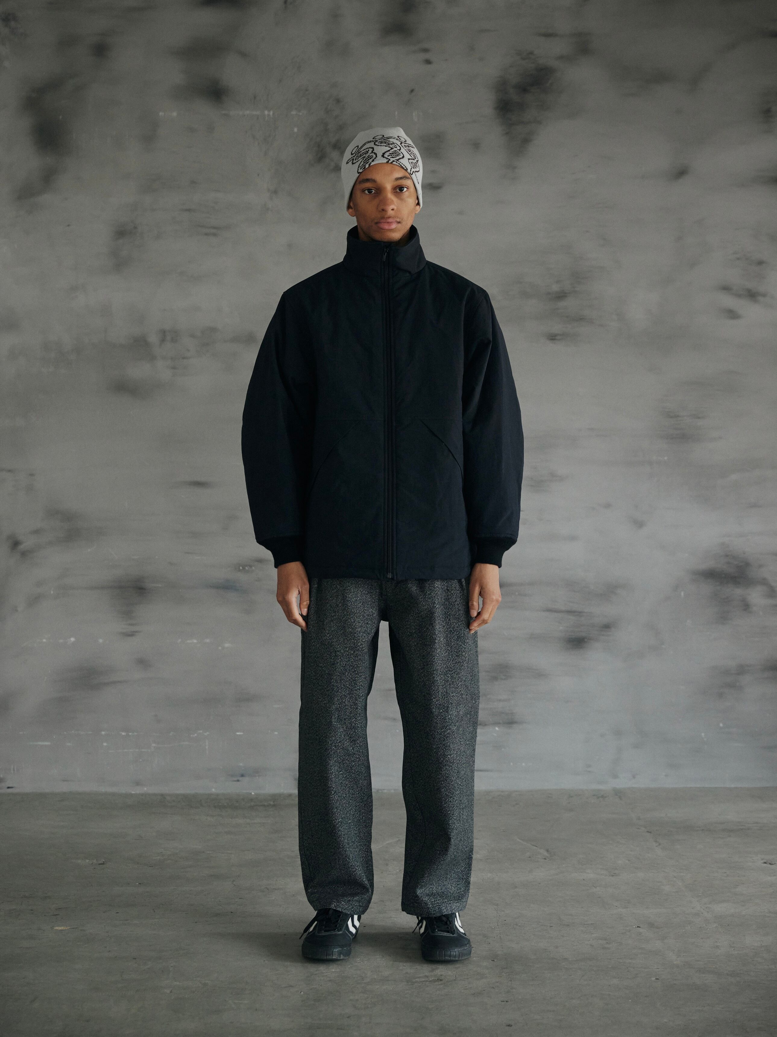 フロントにはフラップ付きの大きめのファスナーポケットを配置し、袋地にはネル地を、衿裏にもフリース地を使用し保温性のある1着。